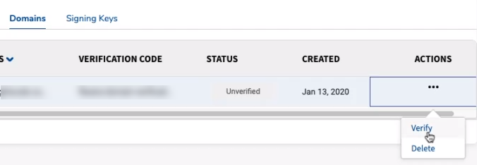 Once a domain is added, it cannot be edited. To make domain changes, go to the domain’s corresponding Actions column. Delete the existing domain by clicking the ellipses (...) and then click Delete . Then continue with Adding a Domain.