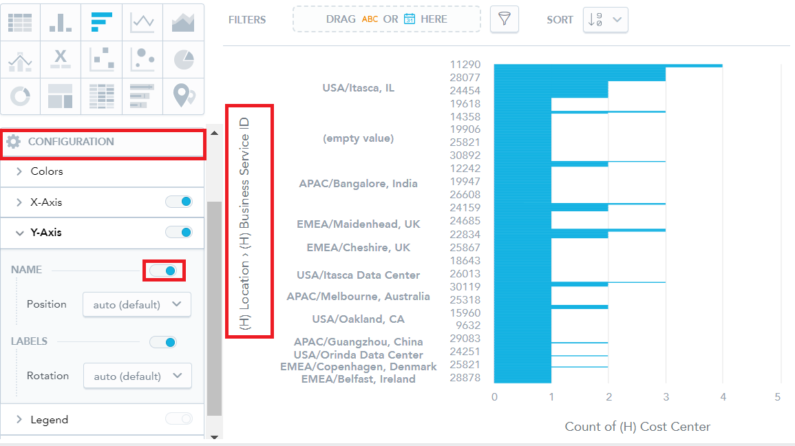You can now choose to display the axis name in column charts and bar charts, even when the charts are sliced by two attributes. To display the X-Axis and Y-Axis names, turn on the Name toggle in the Configuration section.