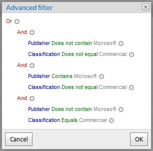 - For example, to prepare for a Microsoft audit, you may need to focus on commercial applications published by Microsoft. For the moment, we need to hide these desirable applications while we focus on moving away all the others. Since the advanced filter does not allow for starting a filter with "Not", we need a more complex filter specification to reveal everything except the Microsoft commercial applications: