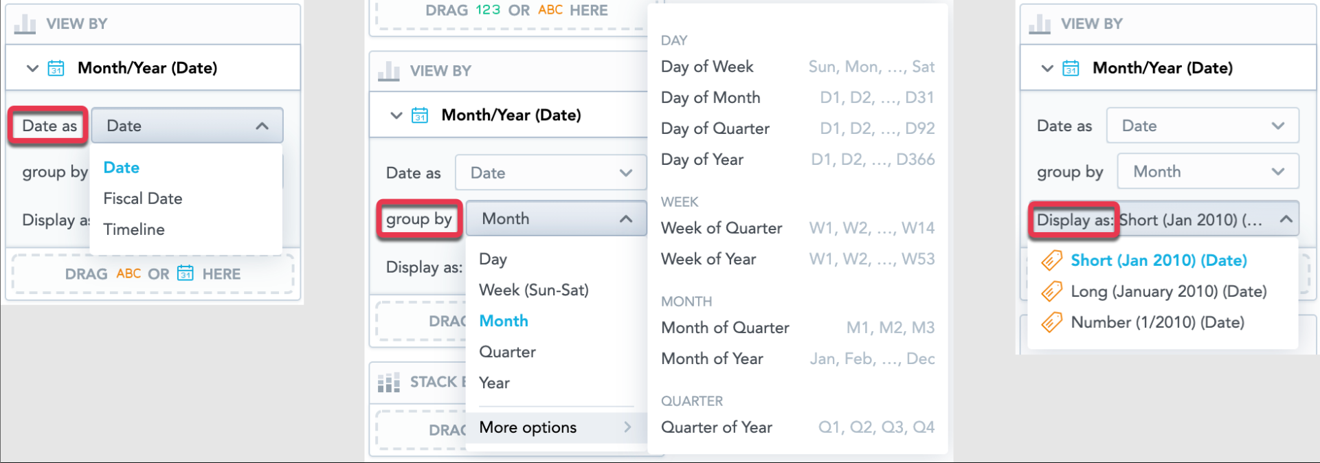 • Group them by day, week, month, quarter, year, or additional date attributes, such as day of week or month of year (using the Group by option)