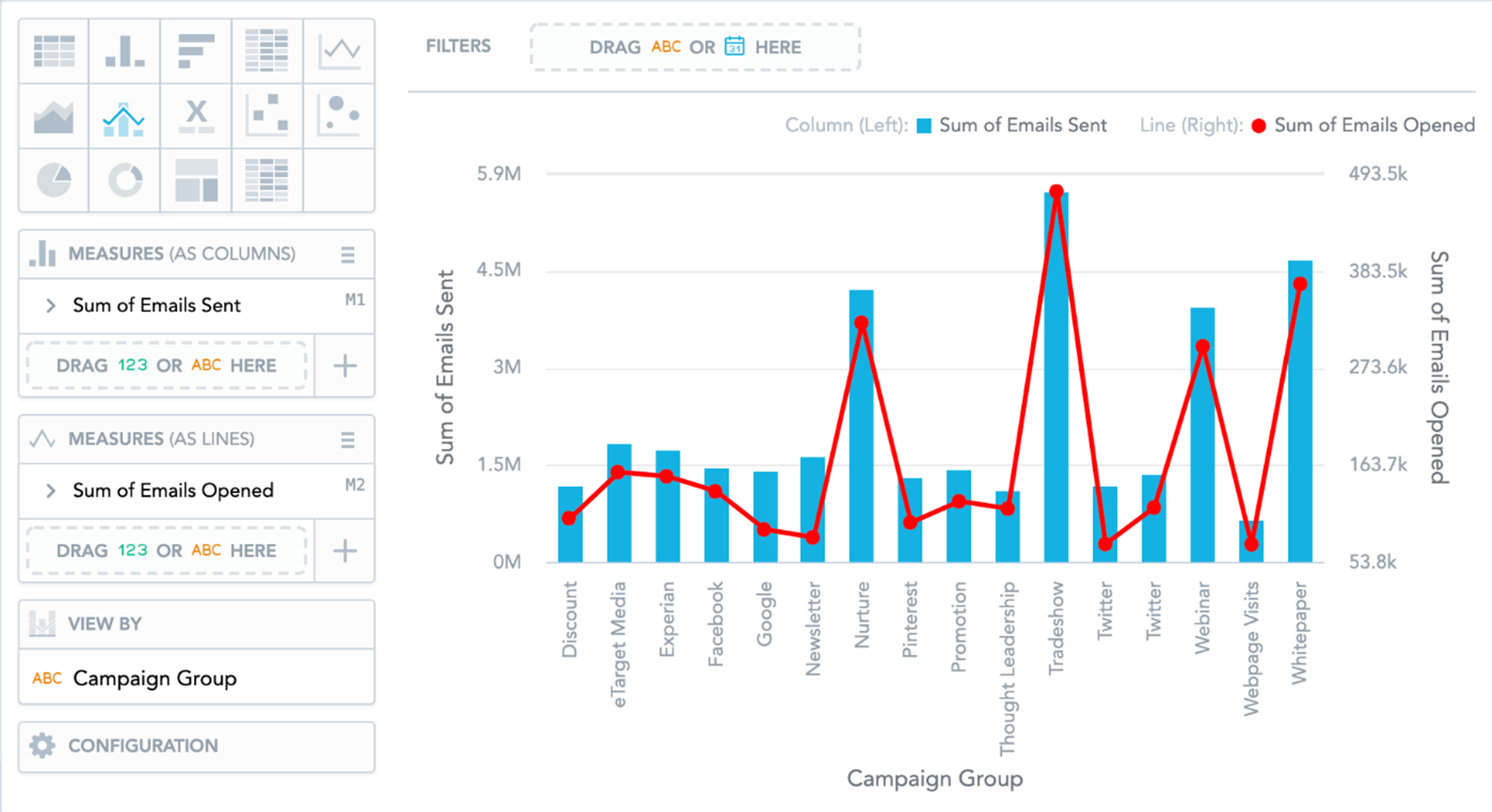 Combo charts have the following sections: two Measures (as columns/lines/area) sections, View by , and Configuration .