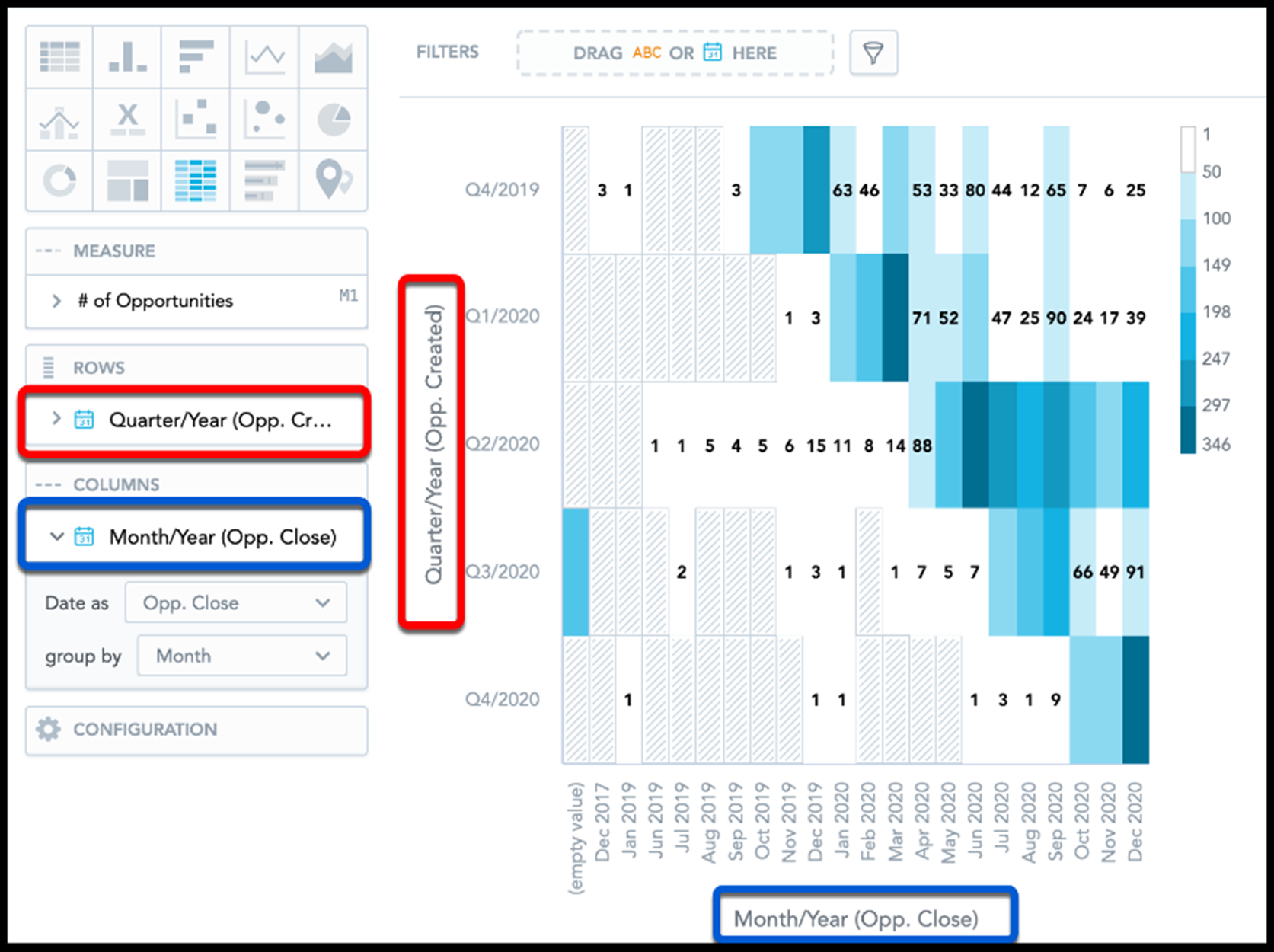Heatmaps have the following sections: Measure , Rows , Columns , and Configuration .