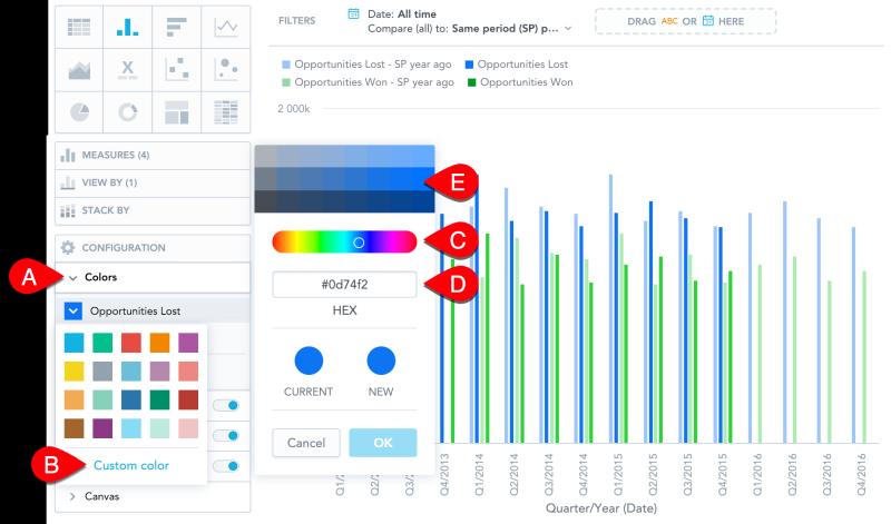For each of the measure/attribute in your insight, you can change the color in which the insight displays it. For example, you want to display Opportunities won in green and Opportunities lost in blue.