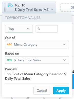 You want to see which are the top five menu categories that has sold best—select Top 5 out of All based on Daily Total Sales .